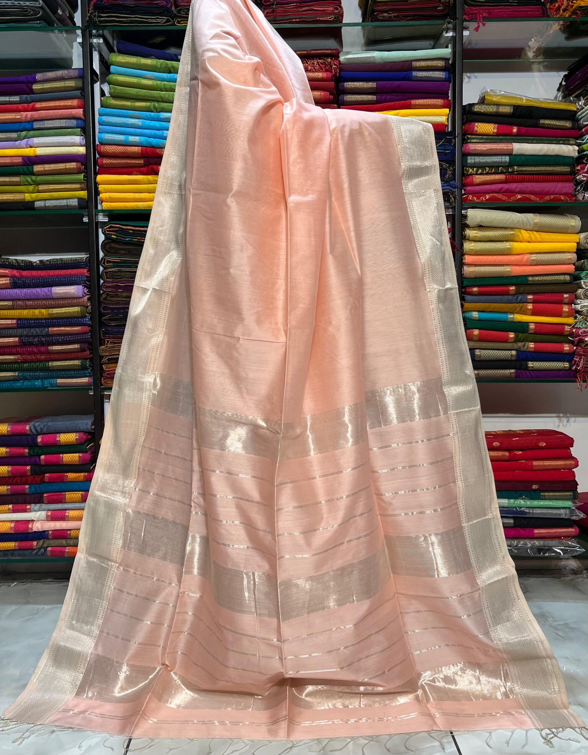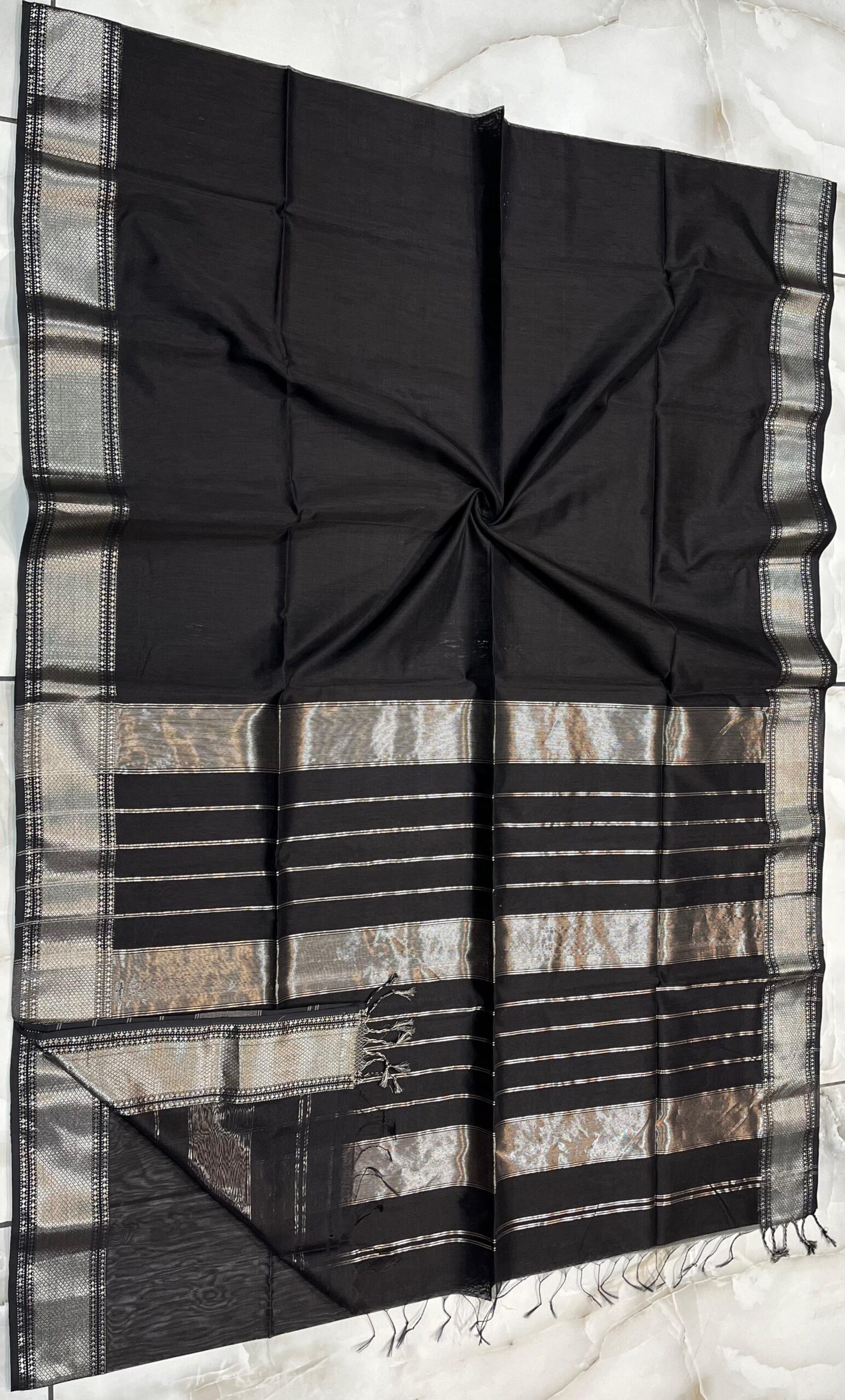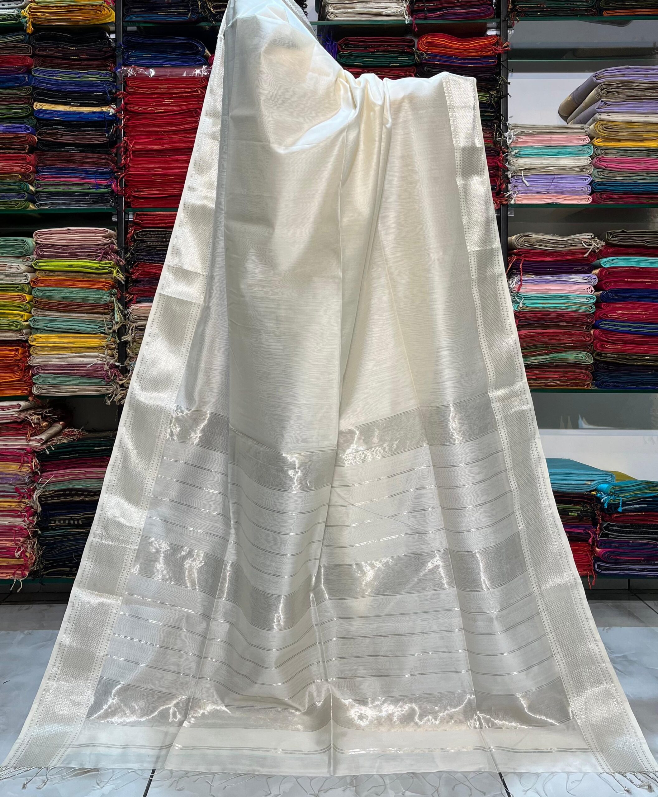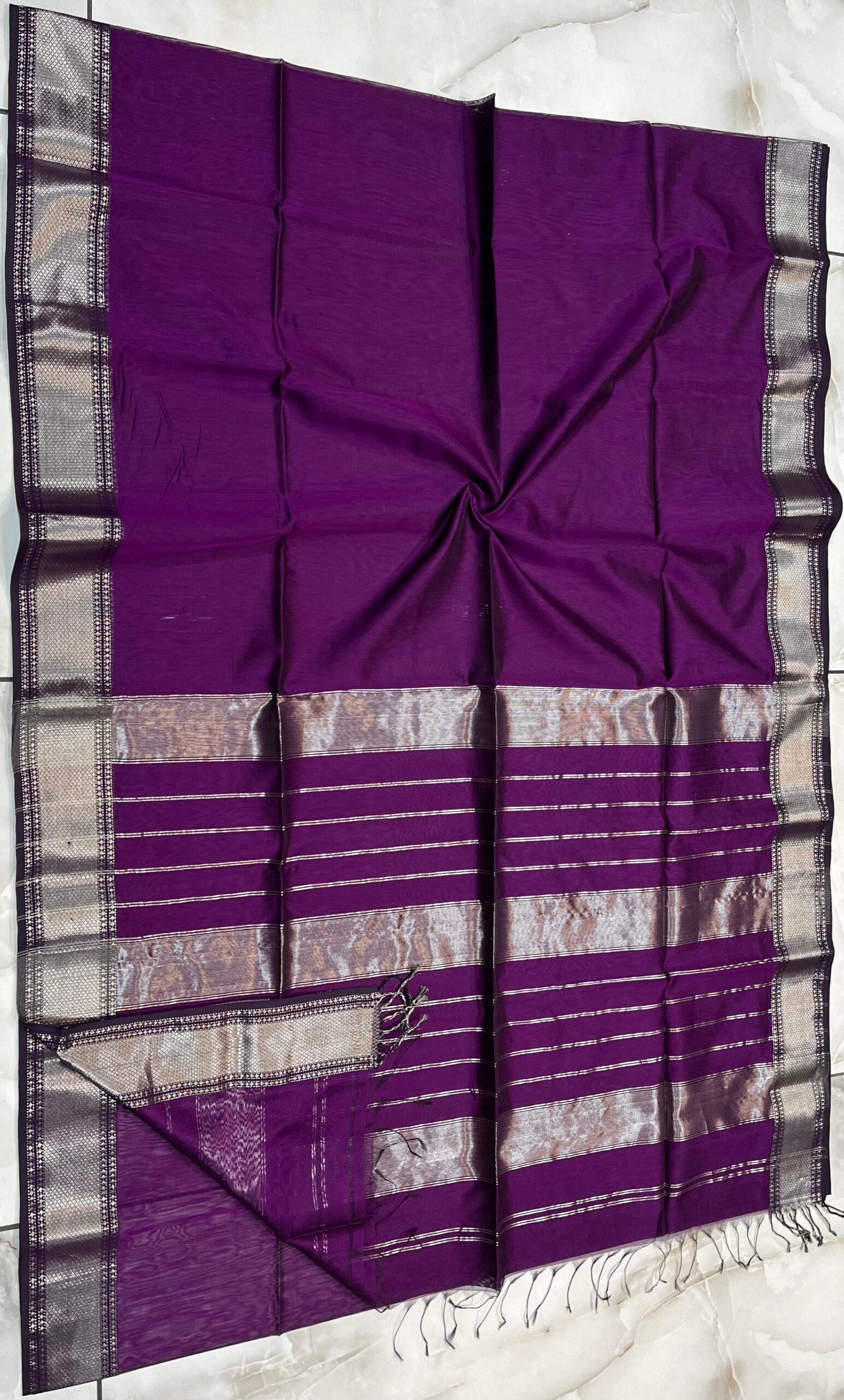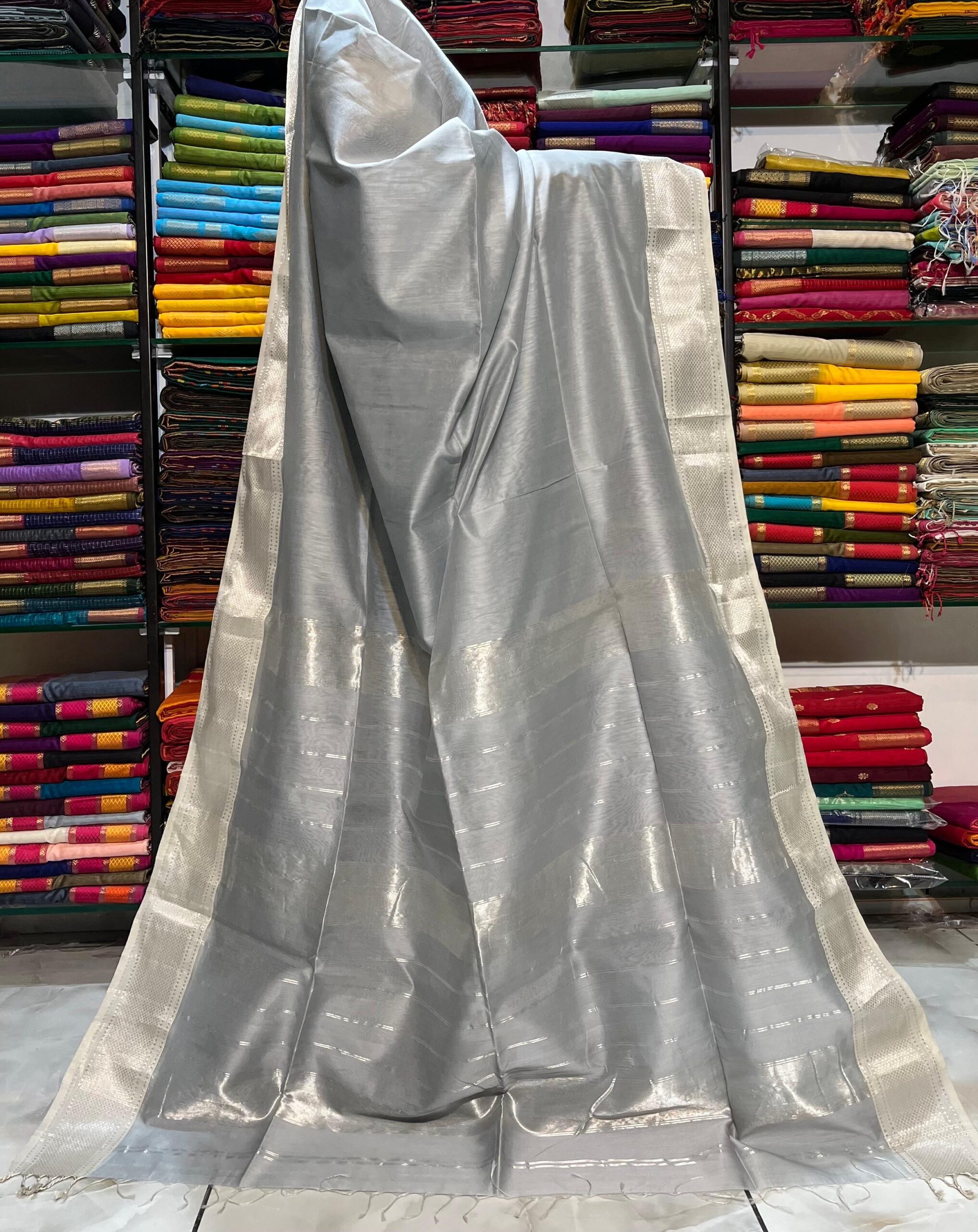 Be the first to review “Maheshwari Silver Zari Hansa Border Saree”